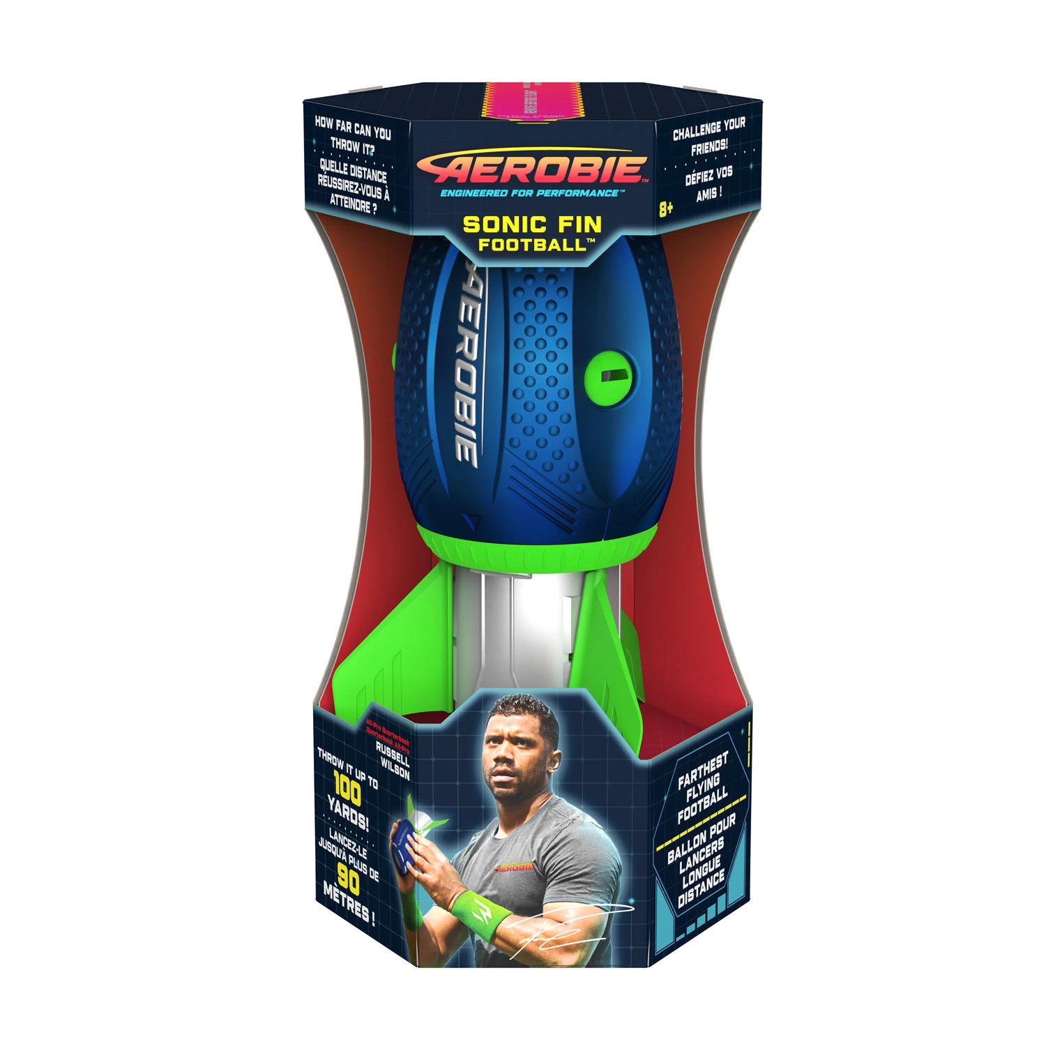 Aerobie Sonic Fin. Speciaal gevormde rugbybal met staart, waardoor hij tot wel 90 meter geworpen kan worden. Geschikt voor kinderen vanaf 8 jaar.