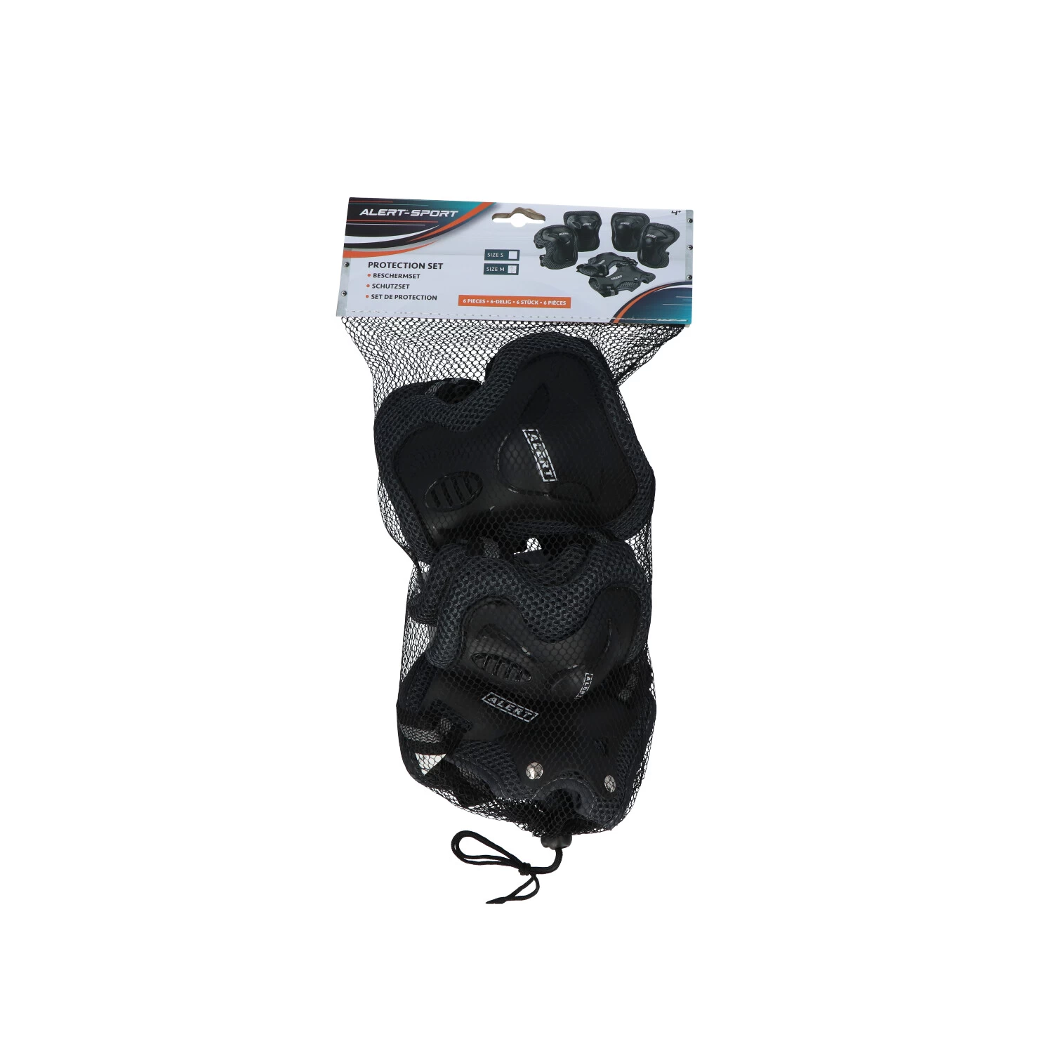 De zwarte beschermset maat S van Alert is geschikt voor kinderen vanaf vier jaar.