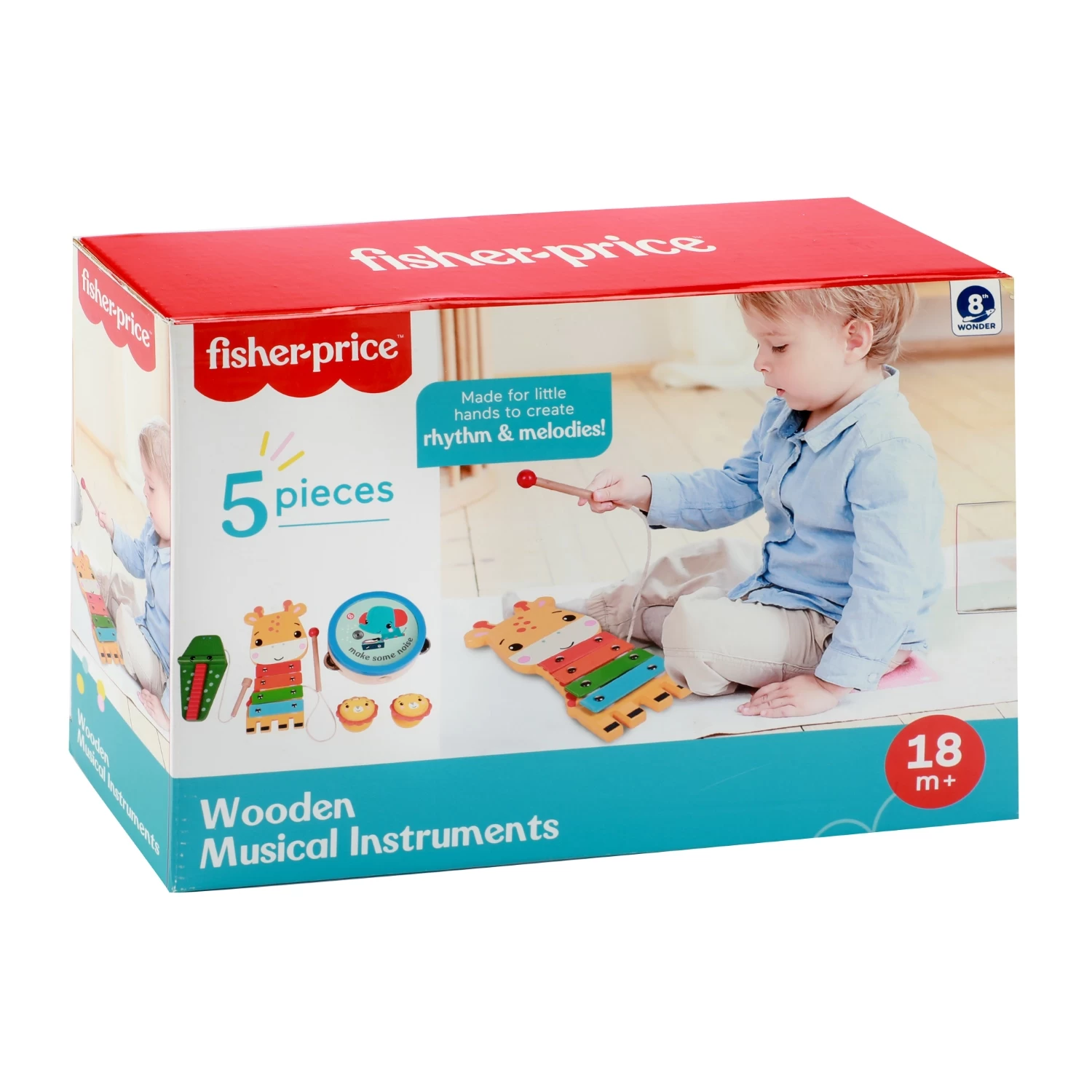Maak lekker veel lawaai met de nieuwe houten Fisher Price Muziekinstrumenten! Deze muziekinstrumenten zijn de perfecte aanvulling op de collectie traditioneel houten Fisher Price-speelgoed en zien er uit als de favoriete dieren van uw kind! Deze 5-delige set bestaat uit een xylofoon, tamboerijn, guiro en twee castagnetten. Ze helpen bij het ontwikkelen van de hand-oogcoördinatie en fijne motoriek. Ook wordt de creativiteit van je kind gestimuleerd. Geschikt voor kinderen vanaf 18 maanden.