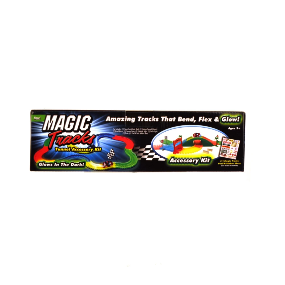 De Magic Tracks buigen en krommen snel in vrijwel elke richting! De Tunnel Accessory Kit bevat een start en finish poort, een brug en tunnel in 1, verkeersborden, bomen en wegblokkades. Geschikt voor kinderen vanaf 3 jaar en ouder.
