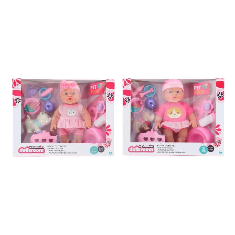 My Beautiful Dolls Room Pop 31cm Drink En Plas 11 Accessoires 2 Assorti. 31 cm grote pop die kan drinken en plassen. Inclusief 11 accessoires: flesje, potje, rammelaar, en huisdier met verscheidene toebehoren. Verkrijgbaar in 2 verschillende versies, vooraf is niet te bepalen welke je ontvangt. Geschikt voor kinderen vanaf 3 jaar.