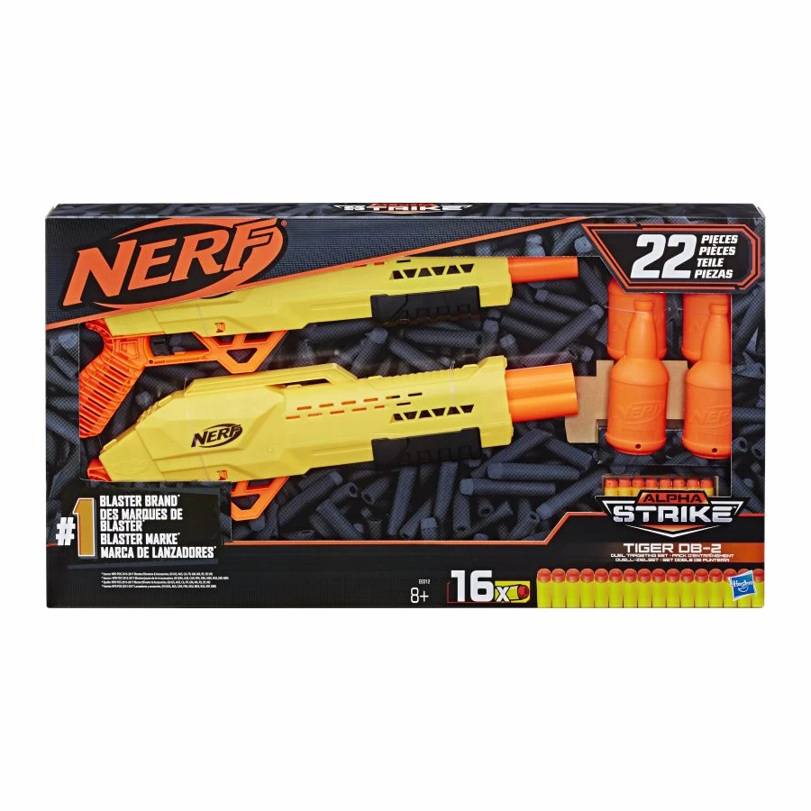 Ga de strijd aan met de Nerf Alpha Strike Tiger DB2! Strijd met of tegen elkaar met de twee blasters, vier flesjes en zestien darts. Dankzij het compacte geweer kan je goed rondlopen en tegenstanders besluipen. Natuurlijk is het wel handig om eerst je schietvaardigheden te perfectioneren door op de flesjes te schieten. Wie wint dit gevecht?