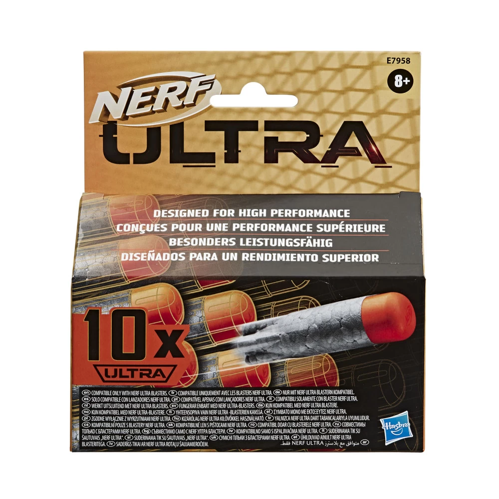 Nerf Ultra 10 Darts Refill. Een verpakking met 10 Nerf Ultra foam darts, geschikt voor de Nerf Ultra blasters. Geschikt voor kinderen vanaf 8 jaar.