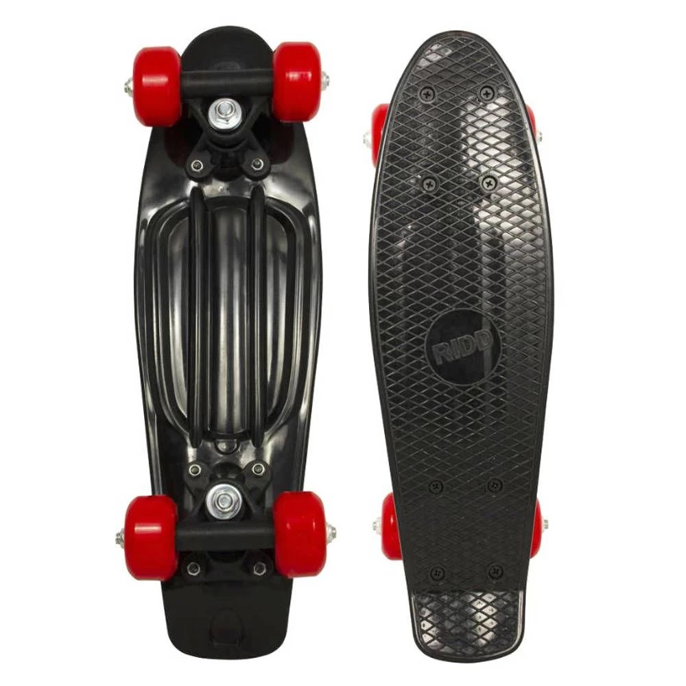 Ga lekker buiten rond rijden op dit stoere skateboard! Hij heeft een gave, zwarte plank met gegoten verstevigingsribben aan de onderkant, een gripprofiel op de bovenkant en PU gegoten rode wielen. Het board is 43 cm lang. Het zwarte skateboard is geschikt voor skateboarders vanaf 4 jaar en ouder.